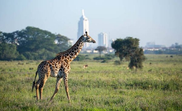 Here, lions hunt on open plains with skyscrapers on the horizon, rhinos graze peacefully, and giraffes stroll beneath acacias.